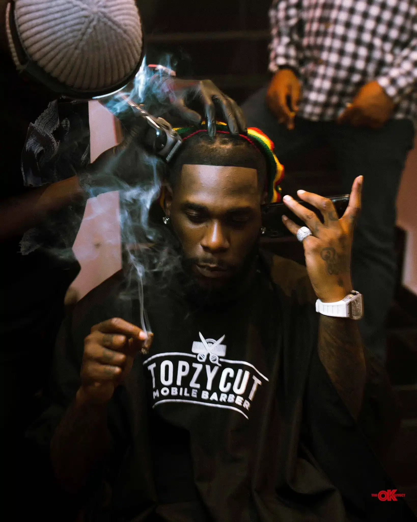 A photo of Burna Boy getting his haircut by Topzy. Photo Credit: @topzycut Source: @Twitter